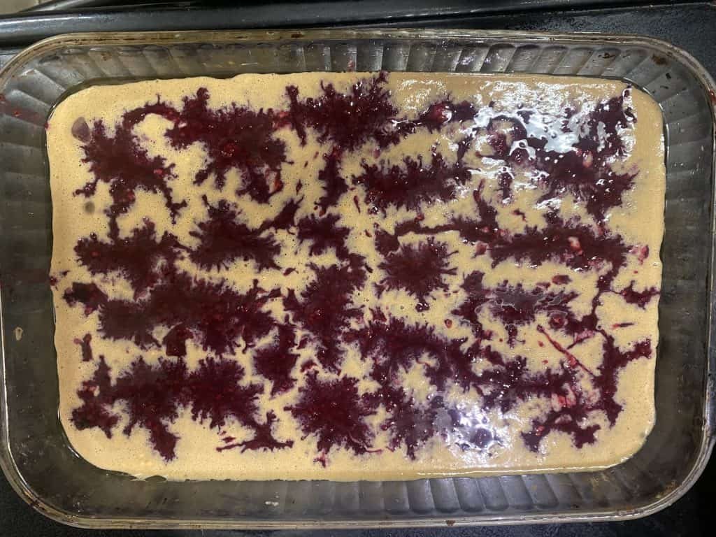 - Carefully dip/pour your fruit with the juice on top of the batter.
